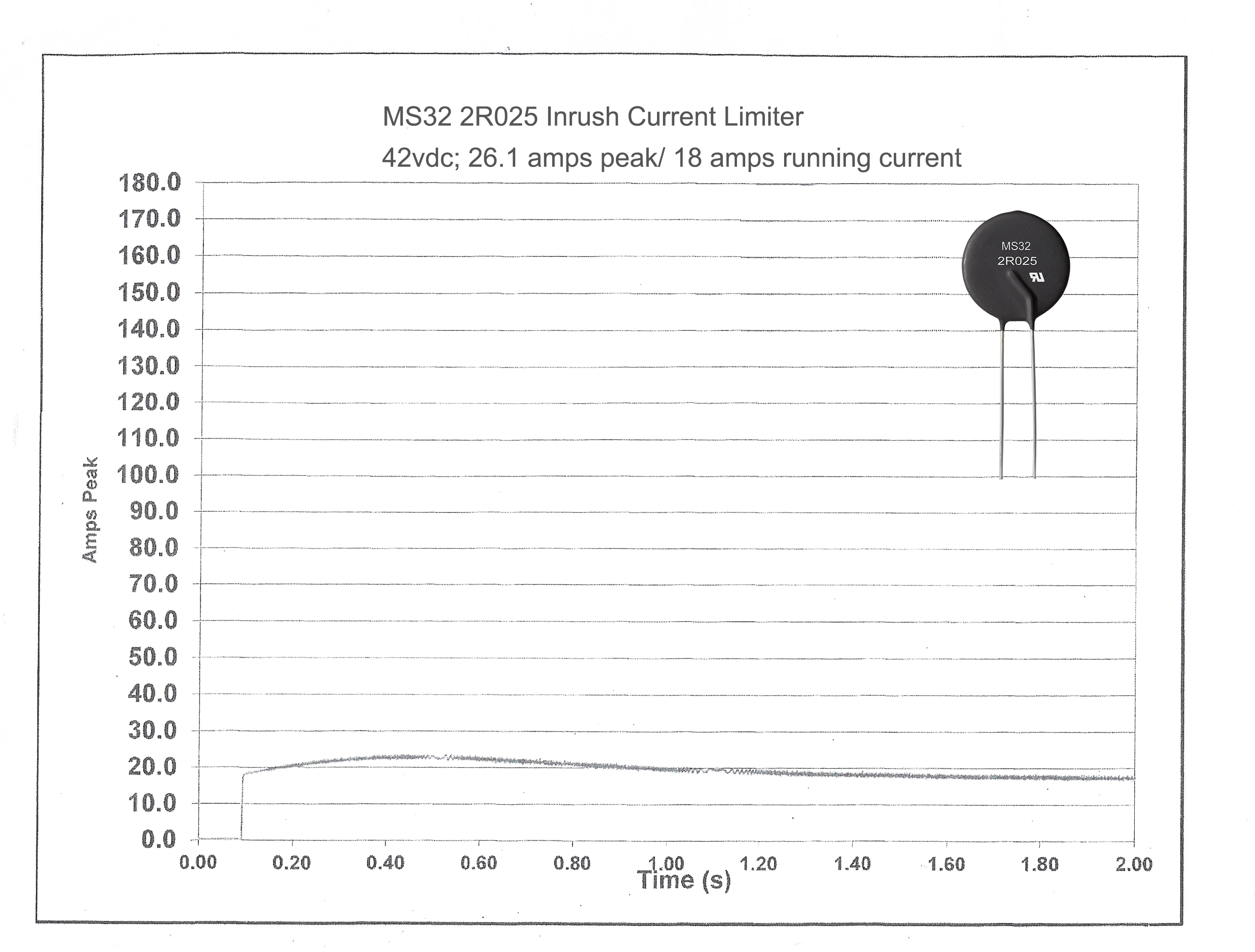 The customer came to Ametherm for help and the engineers reviewed the problem. They suggested using an MS32 2R025 power thermistor rated at 25 amps of steady state current. When the vacuum motor ran for over 5 minutes, the inrush protection device displayed 26.1 amps at peak and 18 amps of steady state current [See illustration 1]. While the MS32 2R025 inrush resistor did perform well, the body temperature of 213 ºC was higher than what the customer wanted.