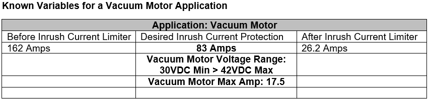 We start with a customer who had a vacuum motor with the above known variables. The customer selected an MS32 10015 inrush current limiter on their own before coming to Ametherm for help. The MS32 10015 is rated for 15 amps of steady state current. The customer ran the vacuum motor with the additional series resistance for over 5 minutes at 17 amps of steady state current. The inrush resistor ultimately failed because it ran above the rated 15 amps of steady state current.